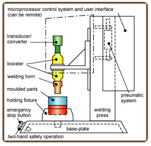 It works on the basic principles of Ultrasonic waves. Ultrasonic Vibration creates dynamic shear stress in between the contacts of two workpieces. Due to local plastic (Energy Director) deformation and heat generated due to the friction between contact surfaces, The joint formation will take place at the interface.